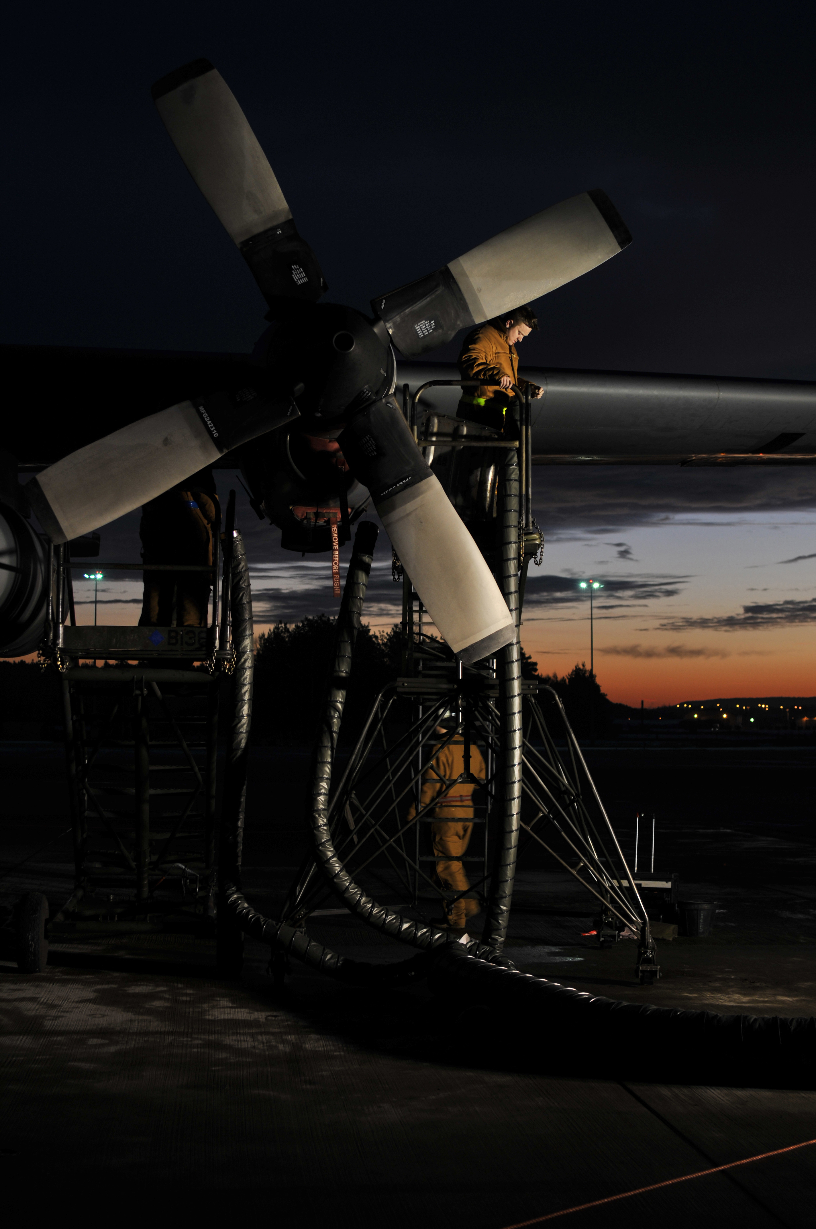 Members of the 86th Aircraft Maintenance Squadron, work on the engine of a C-130 at Ramstein Air Base Jan. 13, 2009. The aircraft is the prime transport for air dropping troops and equipment into hostile areas. (U.S. Air Force photo by Senior Airman Nathan W. Lipscomb)
