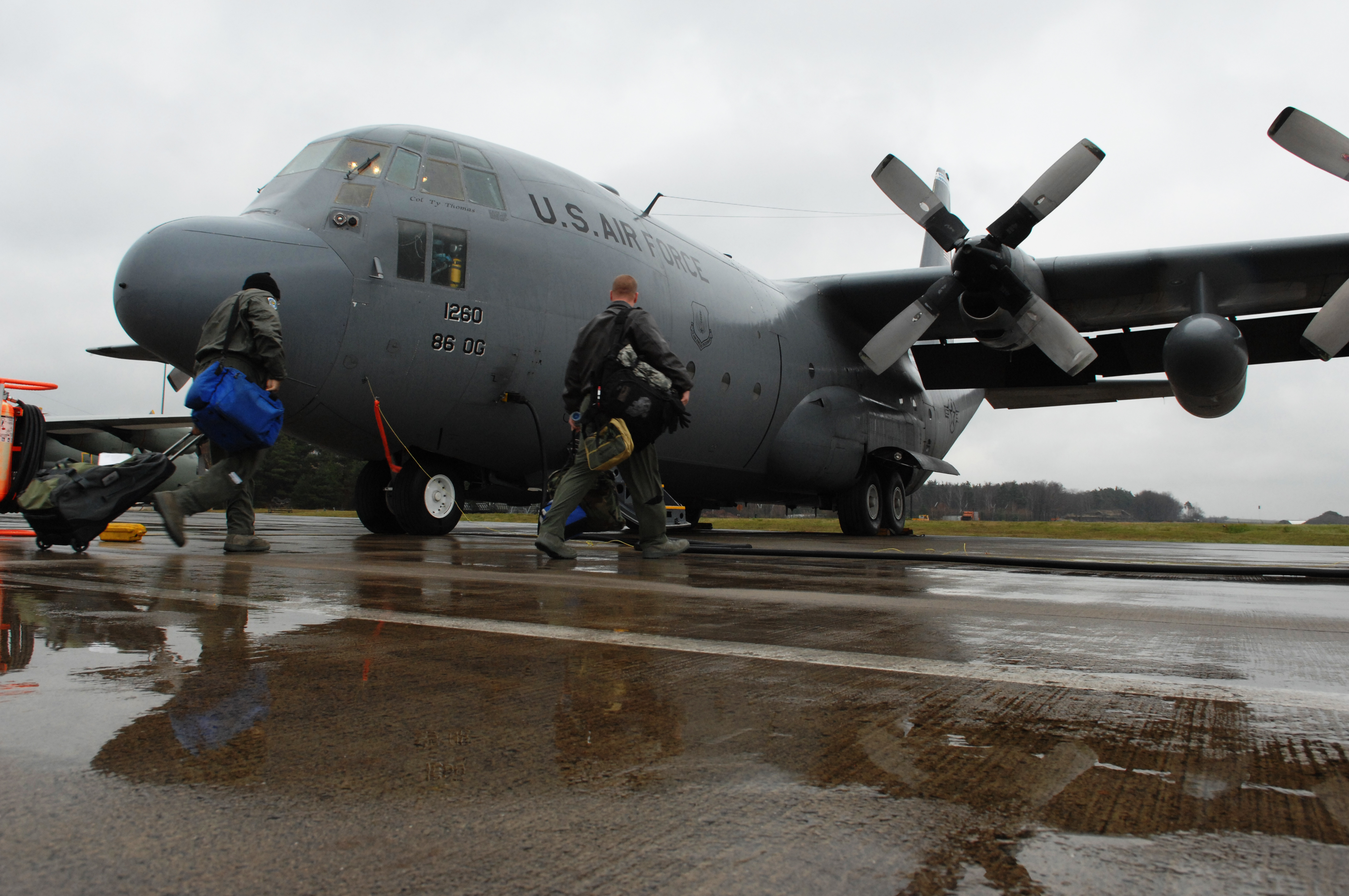 Tech. Sgt. Juan Newman (left), 37th Airlift Squadron flight engineer, and Staff Sgt. Drew Holsenback, 37th AS loadmaster, carry their belongings onto a C-130 Hercules aircraft, Ramstein Air Base, Germany, Dec. 2, 2008. Members of the crew get to the aircraft first to ensure it is safe for flight and ready to go. (U.S. Air Force photo by Senior Airman Amber Bressler)