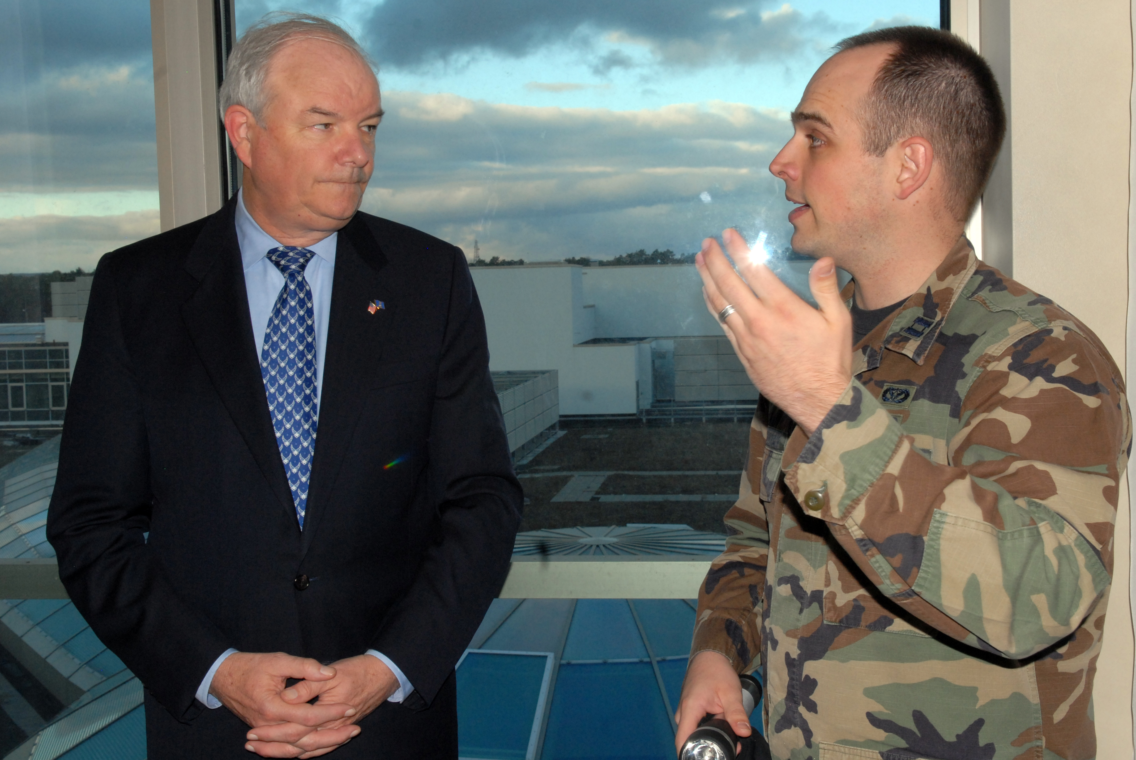 Captain Mark Sheehan, 435th Civil Engineering Squadron chief operations and quality assurance branch, Kaiserslautern Military Community Center resident directors office, briefs Michael W. Wynne, Secretary of the Air Force, about the new KMCC and the changes that are happening in the next few months at Ramstein Feb. 6. Both U.S. and German representatives at all levels remain committed to finishing the project. (U.S. Air Force photo/Airman 1st Class Ruth Holcomb)(Released)