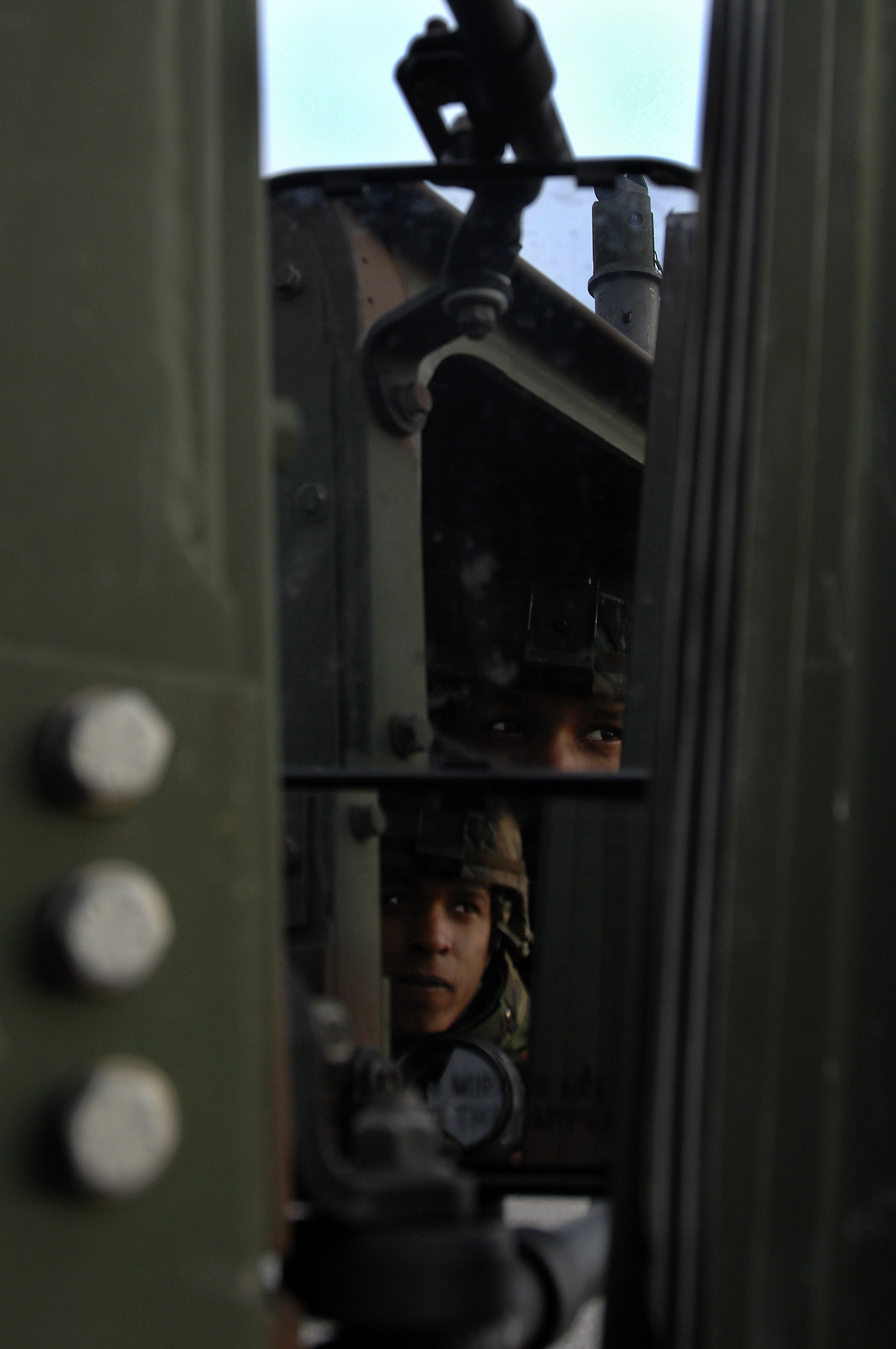 The reflection of Airman 1st Class Kenny Holston, 435th Air Base Wing Public Affairs still photographer, appears in an Air Force humvee mirror as he takes position behind the door of the humvee to capture a peek action photo of security forces members participating in a two-week long Creek Defender course. The Creek Defender course covers an array of tactical training methods that security forces members will need to be successful in a deployed environment. (U.S. Air Force Photo/Airman 1st Class Kenny Holston)
