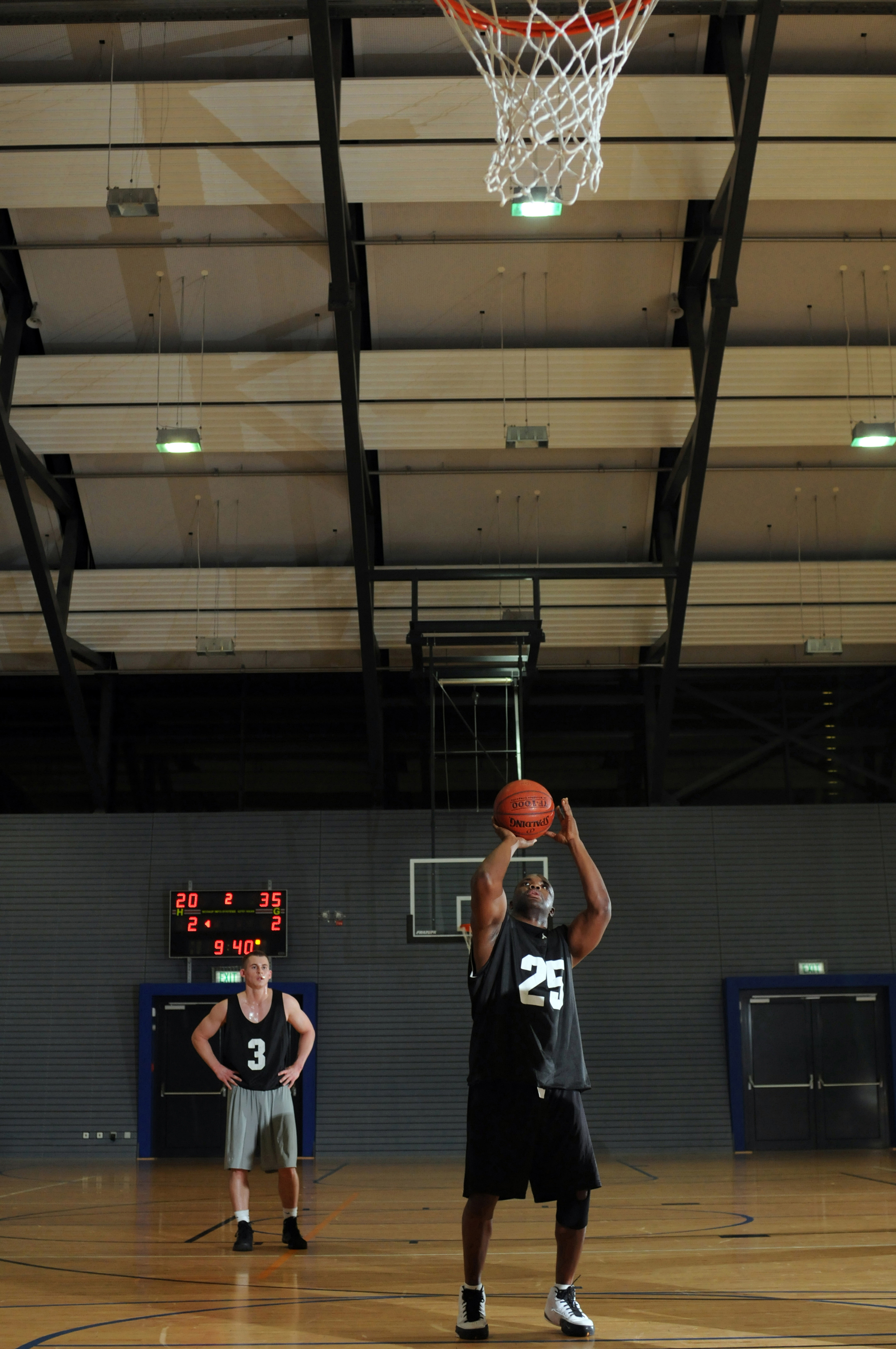 Tech. Sgt. Therman Watkins, 835th Civil Engineer Squadron, shoots a free throw while Airman David Thal watches during intramural basketball Oct. 12, 2008, Ramstein Air Base, Germany. The 835th CES beat the 569th U.S. Force Protection Squadron, 48-31. (U.S. Air Force photo by Senior Airman Nathan Lipscomb)