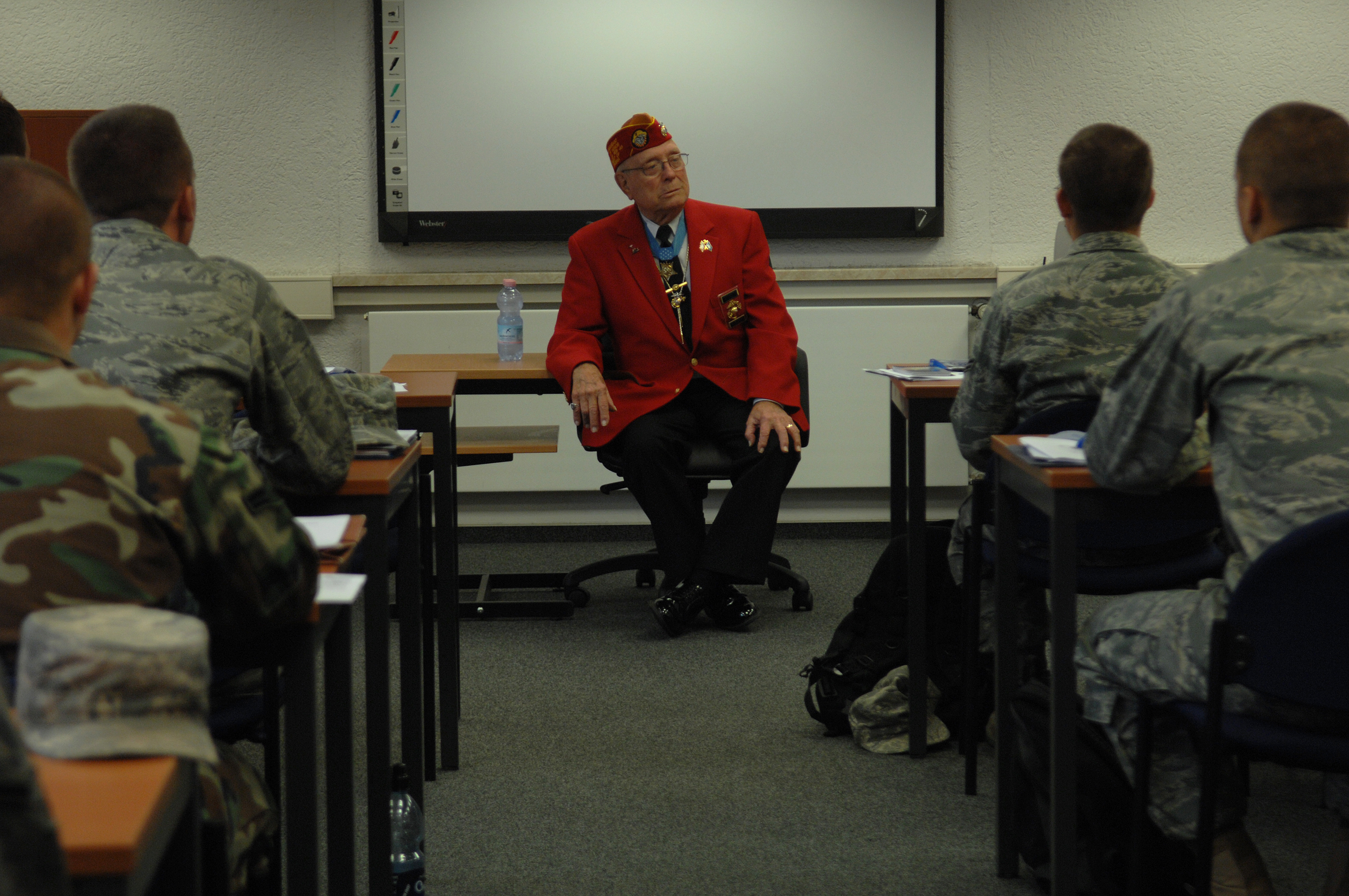 Hershel W. Williams, U.S. Marine Corps, Congressional Medal of Honor recipient, talks to students at the First Term Airmen Center, Ramstein, Germany, Oct. 21, 2008. Mr. Williams was awarded the Medal of Honor for heroic actions during World War II. (U.S. Photo by Airman 1st Class Tony R. Ritter)