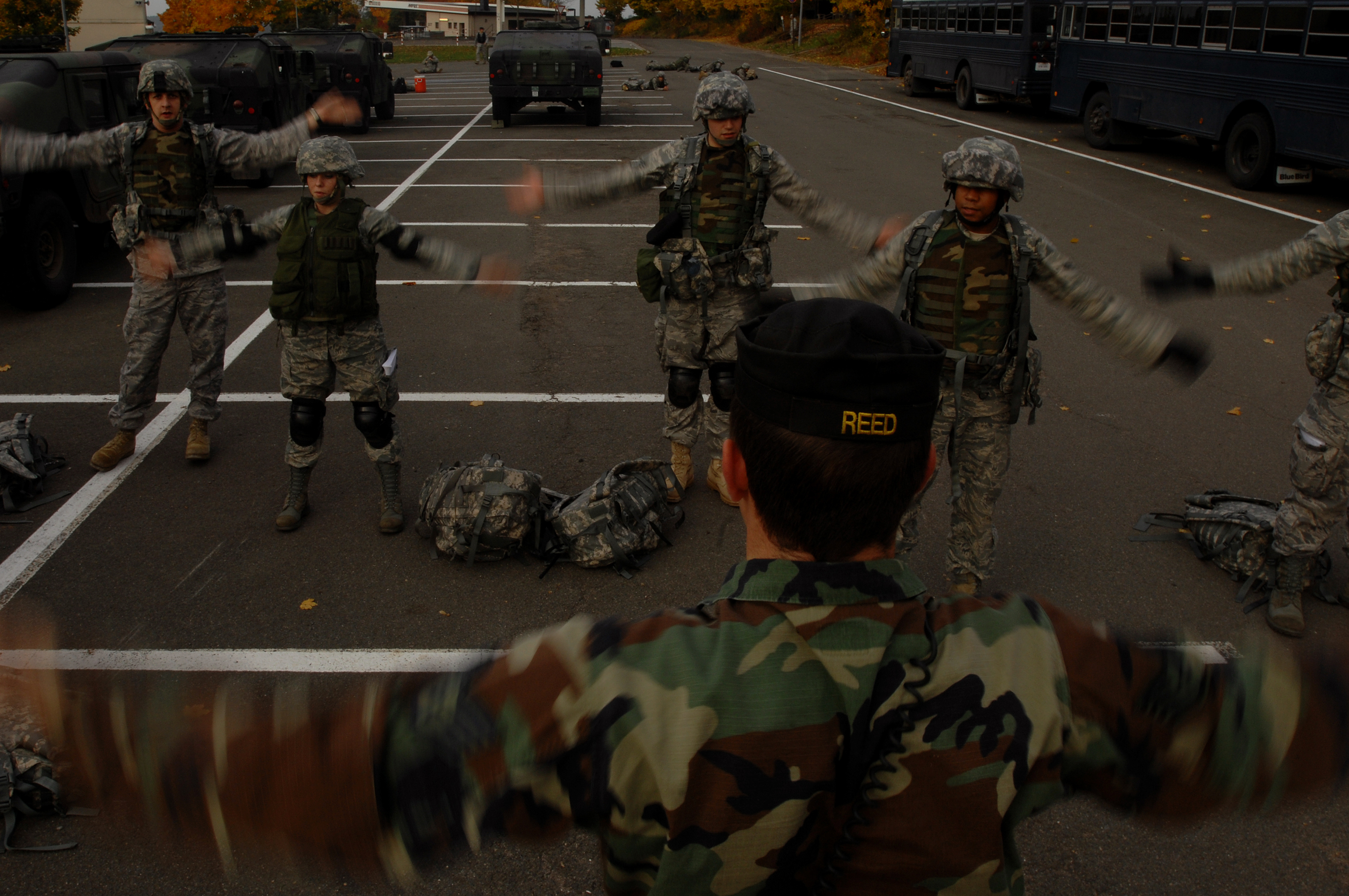 United States Staff Sgt. Aaron Reed, 786th Security Forces Squadron, Creek Defender instructor (center), leads Security Forces members from all over United States Air Forces in Europe in a physical training exercises during their participation in Creek Defender, Sembach Annex, Germany, Oct. 10, 2008. The Creek Defender course covers an array of tactical training methods that security forces members will need to be successful in a deployed environment. (U.S. Air Force photo by Airman 1st Class Kenny Holston)(Released)*