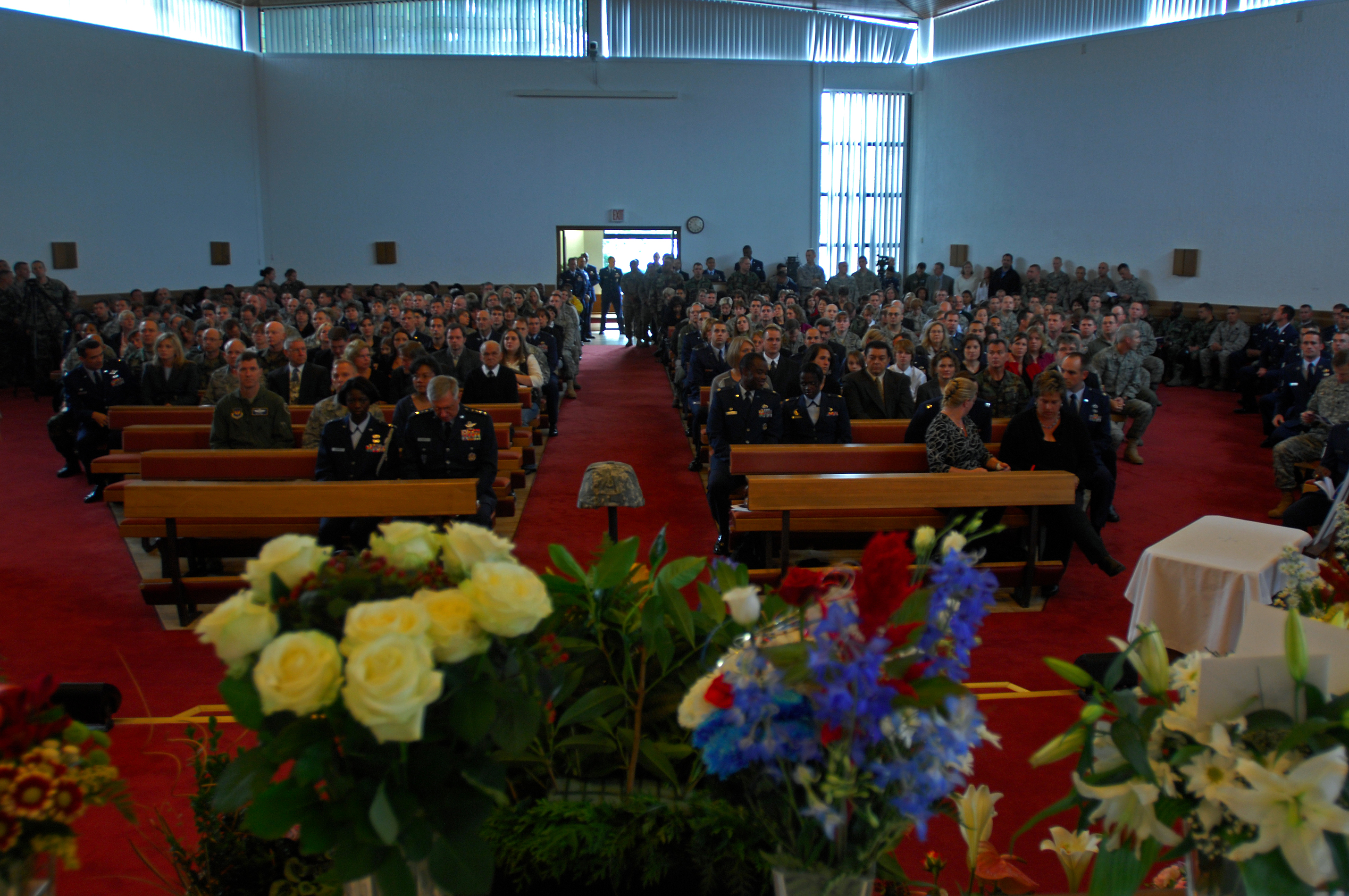 United States military members attend the memorial service of Maj. Rodolfo Rodriguez, 86th Construction and Training Squadron, at the North Side Chapel, Ramstein Air Base, Germany, Sept. 25, 2008. Maj. Rodriquez gave his life to his country at age 34 on Sept. 20 while supporting Operation Enduring Freedom in Pakistan. (U.S. Air Force photo Airman 1st Class Kenny Holston)(Released)