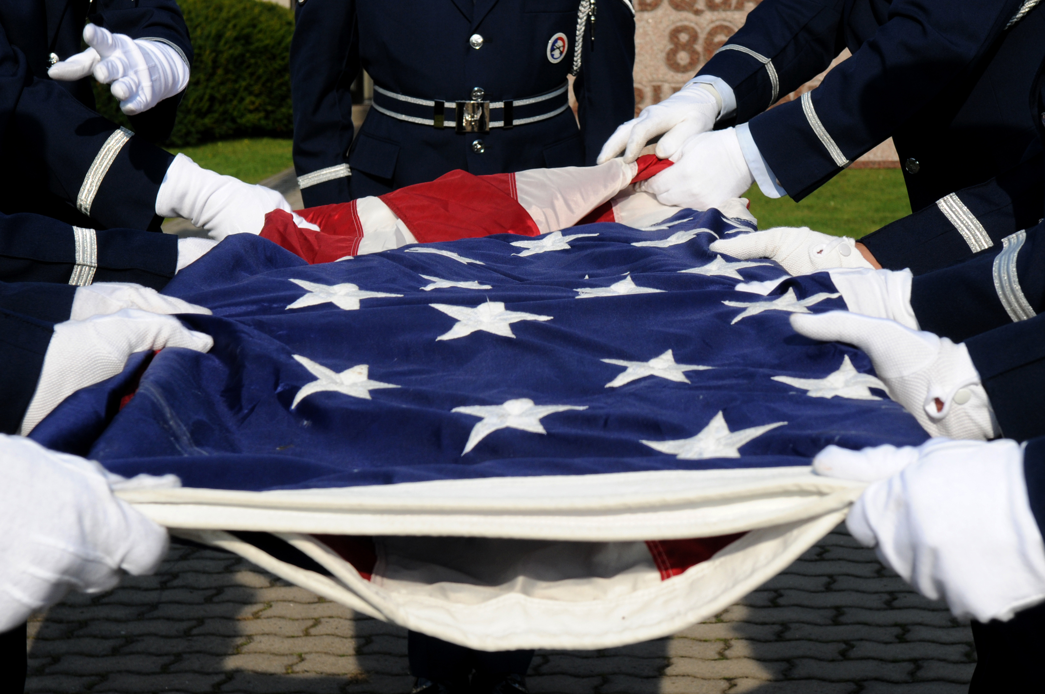 Members of the Ramstein honor guard fold the American flag during retreat, Ramstein Air Base, Germany, Sep. 19, 2008. Retreat was held in honor of POW/MIA day. (U.S. Air Force photo by Senior Airman Kelly LeGuillon)(Released)
