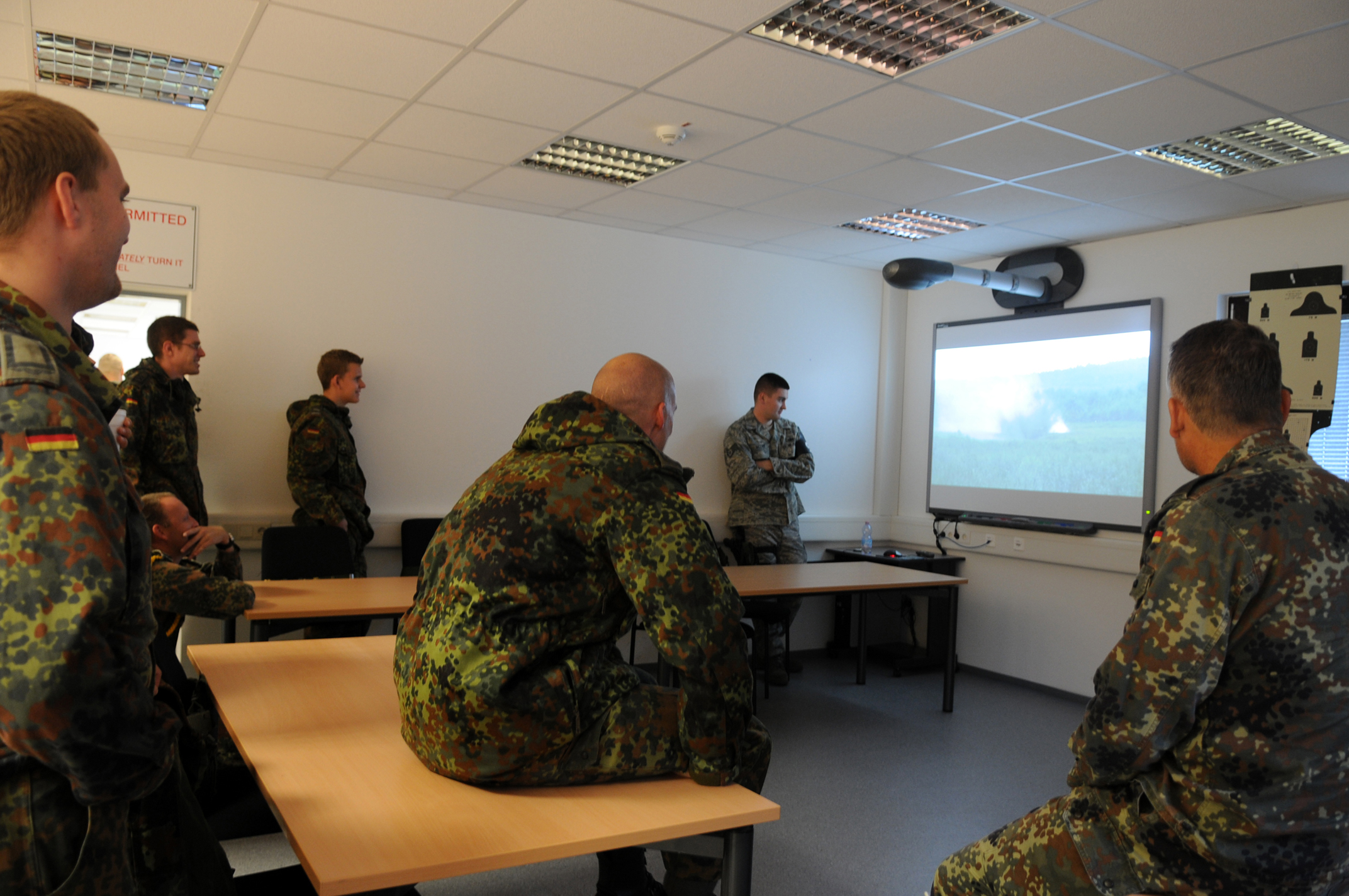 Members of the Belgian, French, and German military watch training videos at Combat Arms Training and Maintenance, Kapaun Air Station, Germany, Sep. 17, 2008. CATM hosted a weapons familiarization day which included classroom instruction, firing, and a cookout. (U.S. Air Force photo by Senior Airman Kelly LeGuillon)(Released)*