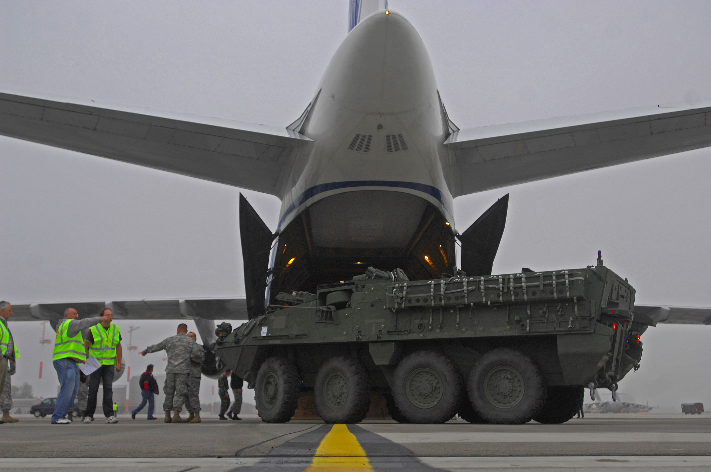 United States Army members from the 3rd Brigade, 2nd Infantry Division, Ft. Louis, Wash., off load Army M115 Striker vehicles from an Antonov AN-124 cargo aircraft, Sept. 4, 2008, Ramstein Air Base, Germany in support of exercise Cooperative Spirit 2008. Cooperative Spirit is a multinational exercise involving United States, British, Canadian, Australian, and New Zealand forces in preparation for a deployment to Iraq. (U.S. Air Force Photo by Airman 1st Class Kenny Holston)