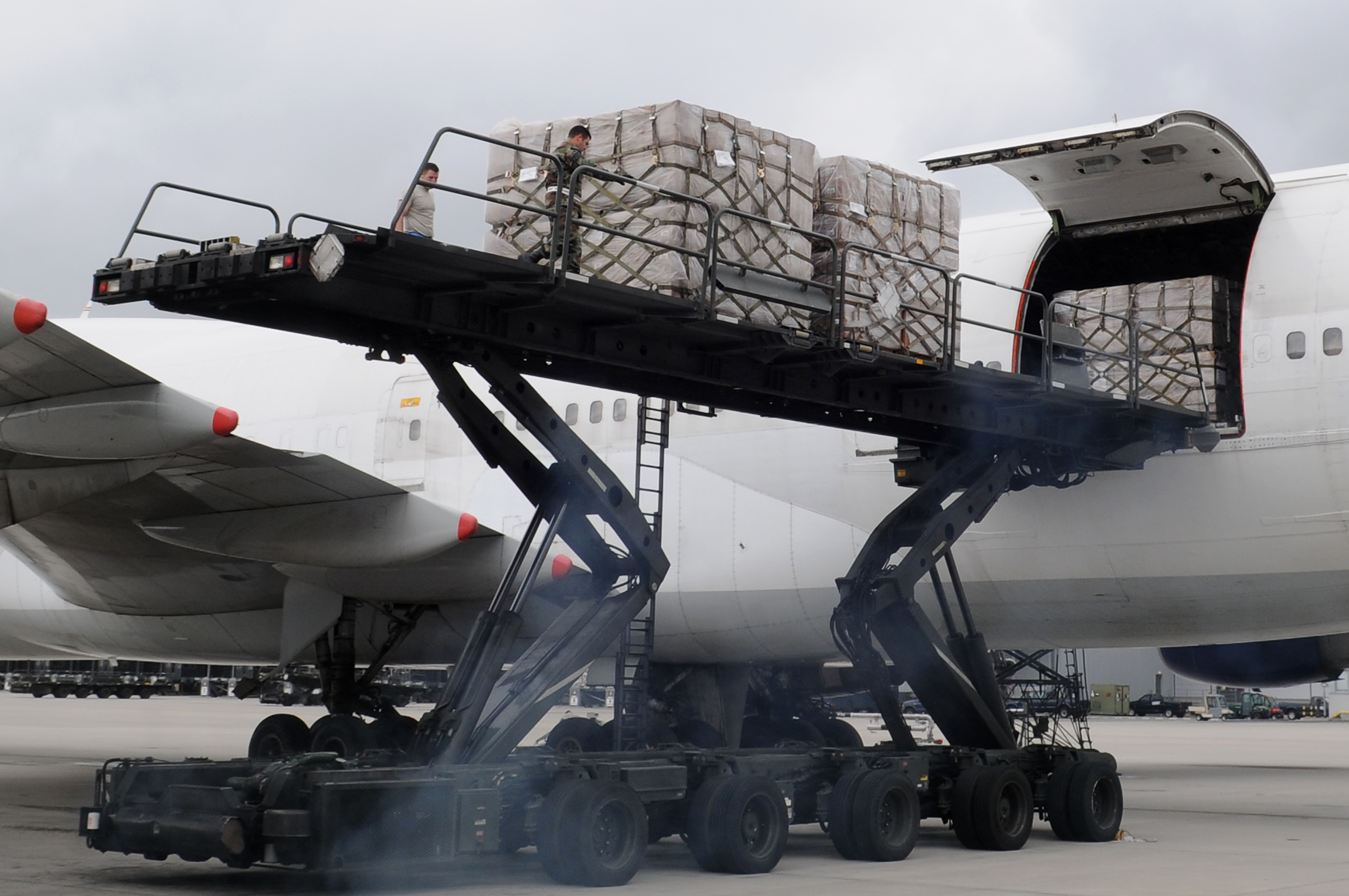 United States Air Force members from the 723rd Air Mobility Squadron and 85th Aerial Port Squadron from Hanscom Air Force Base, Mass., help unload humanitarian relief cargo coming from Charleston Air Force Base, S.C., Aug. 20, 2008, Ramstein Air Base, Germany. The cargo consists of meals ready-to-eat for people of the Republic of Georgia. (U.S. Air Force photo by Airman 1st Class Grovert Fuentes)(Released)*