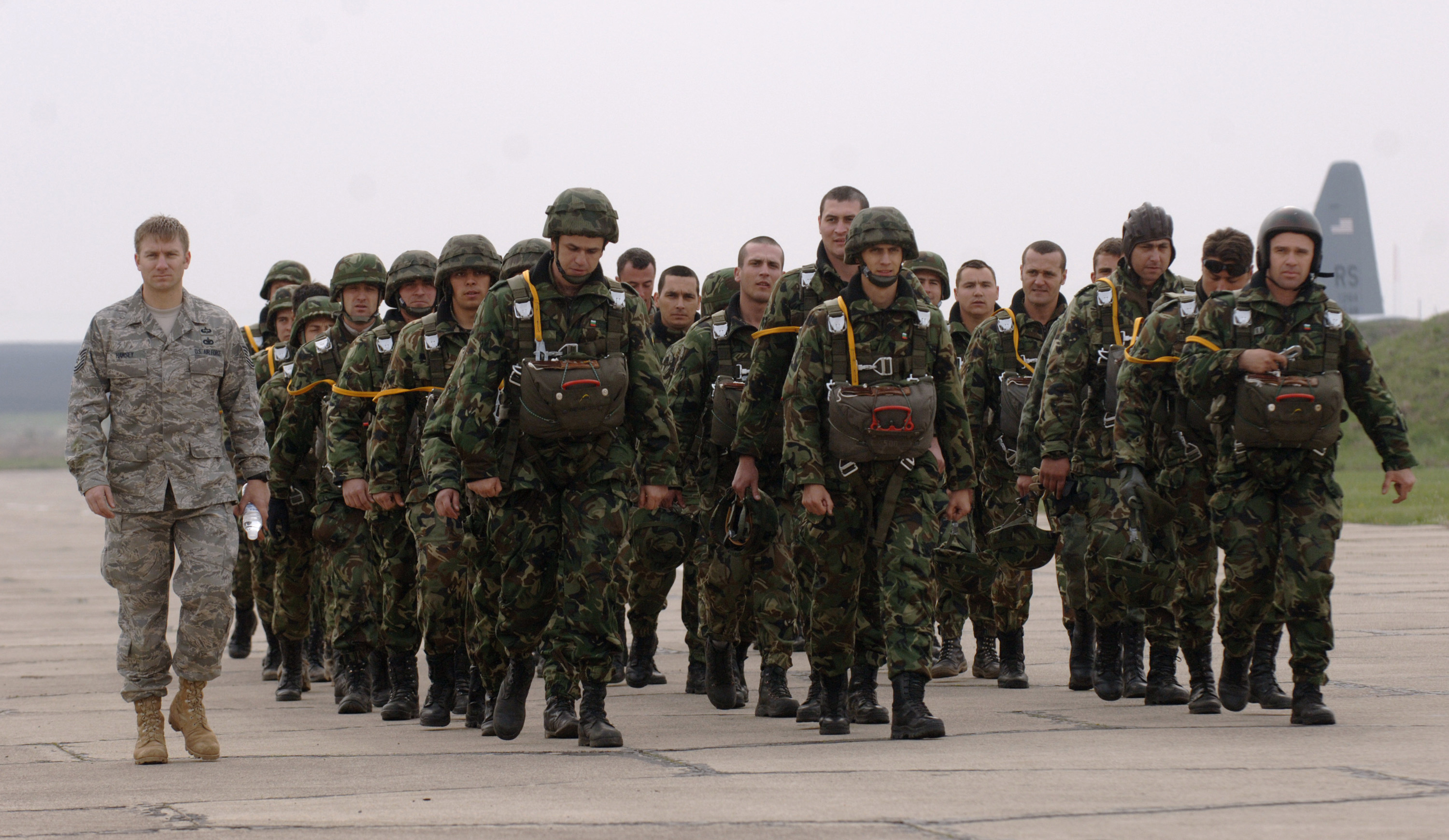 Preparing to board a C-130 Hercules at Bezmer Aviation Base, Bulgaria, Tech. Sgt. Mark Preparing to board a C-130 Hercules at Bezmer Aviation Base, Bulgaria, Tech. Sgt. Marc Hawsey, 786th Security Forces Squadron, walks with 68th Special Forces Brigade Platoon Leader Lieutenant Rosen Angelov (center) before he and eight fellow Airmen join 44 Bulgarian paratroopers in a static line jump for Exercise Thracian Spring 2008.