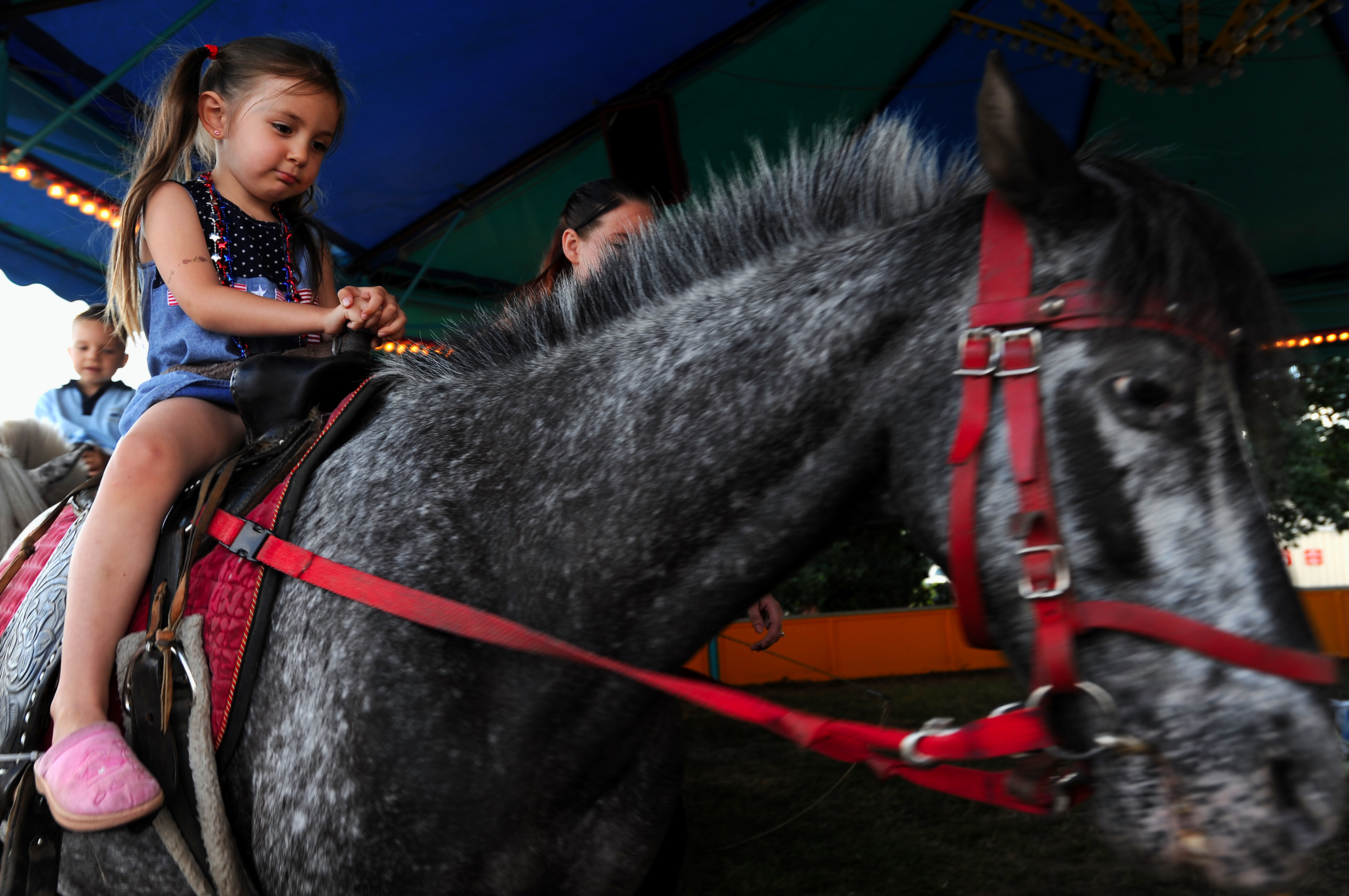 Anya Howells, daughter of U.S. Army Sgt. Tony Howells, experiences her first pony ride during Ramstein's Rockin' Fourth of July celebration, Ramstein Air Base, Germany, 2008. Pony rides were one of the main attractions for children in attendance. (U.S. Air Force photo by Airman 1st Class Kenny Holston)(Released)