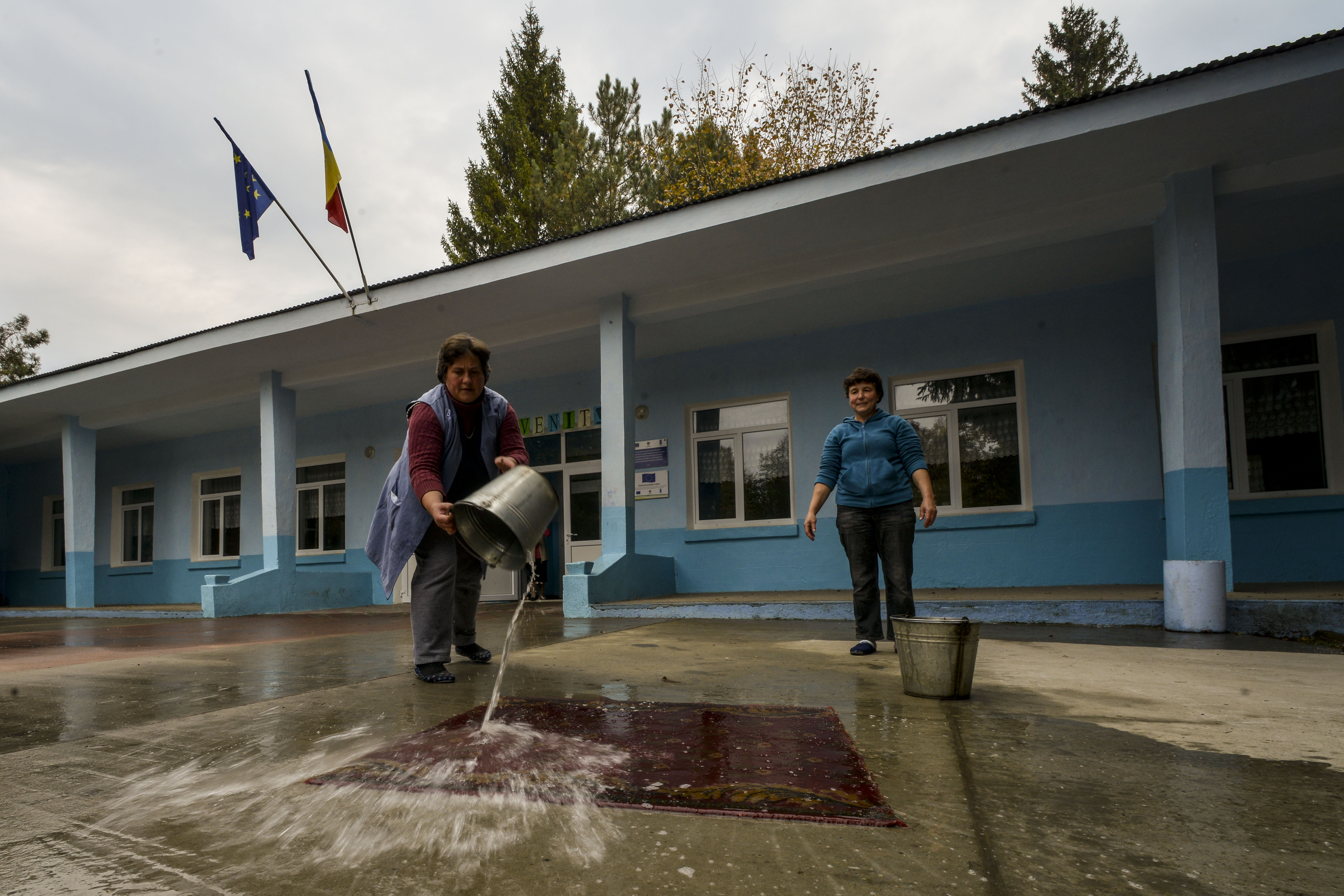 Teachers from Liceul Teoretic Alexei Mateevici School, wash a rug Oct. 19, 2015, in Sanatauca, Moldova. Approximately seven Airmen from the 435th Construction and Training Squadron and the 52nd Civil Engineer Squadron worked on the renovations since Sept. 23. The renovations were part of the Moldova Humanitarian and Civic Assistance program is part of a military and civilian theater security cooperation program the U.S. European Command uses to directly impact civilian communities throughout 17 countries, primarily in Eastern Europe. (U.S. Air Force photo/Senior Airman Nicole Sikorski)