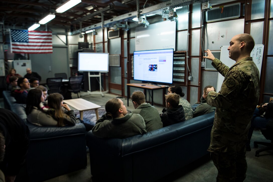 U.S. Air Force 1st Lt. Cody Ray, 24th Intelligence Squadron mission operations commander (right), speaks to members of the Ramstein Cadet Squadron during an open house tour Feb. 2, 2019, on Ramstein Air Base, Germany. Ray talked about the Air Force’s initiative on generating ideas to innovate existing processes. (U.S. Air Force photo by Senior Airman Devin M. Rumbaugh)