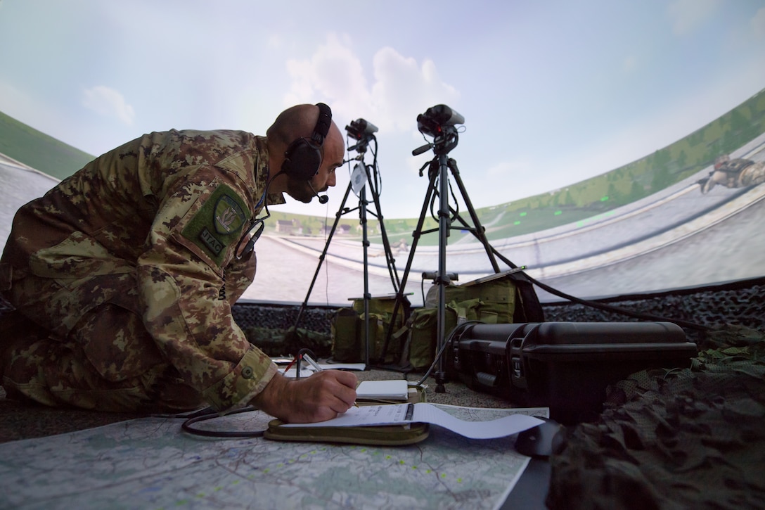 Italian Air Force Senior Airman Grittani Onofrio, Joint Terminal Attack Controller, engages in a training scenario utilizing the U.S. Air Forces in Europe and Air Forces Africa Warfare Center’s JTAC domed simulator at the Warfare Center’s facility in Einsiedlerhof, Germany, Sept. 18, 2020. The Airmen conducted the scenario in preparation for exercise Spartan Warrior 20-9. For SW 20-9, the Warfare Center pulled participants from Geilenkirchen, Germany, for the NATO Airborne Warning and Control System; Netherlands’ Control Reporting Centers; MQ-9 operators from Creech Air Force Base, Nevada; and other entities to include fighter assets from France. (U.S. Air Force photo by Staff Sgt. Devin Boyer)